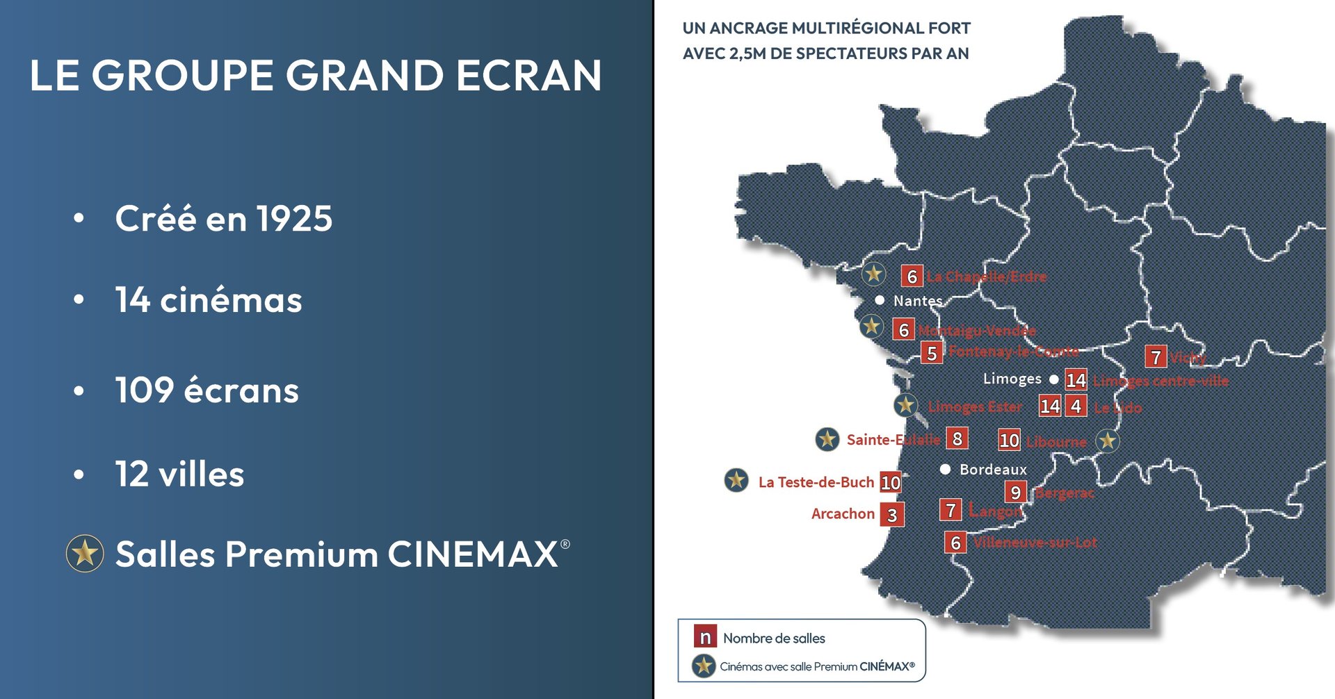 Le Groupe GRAND ÉCRAN dont le siège social est situé à Limoges (87) avec aussi une antenne à Bordeaux (33), est le 9ème circuit français d’exploitation de salles de cinéma en termes de fréquentation.